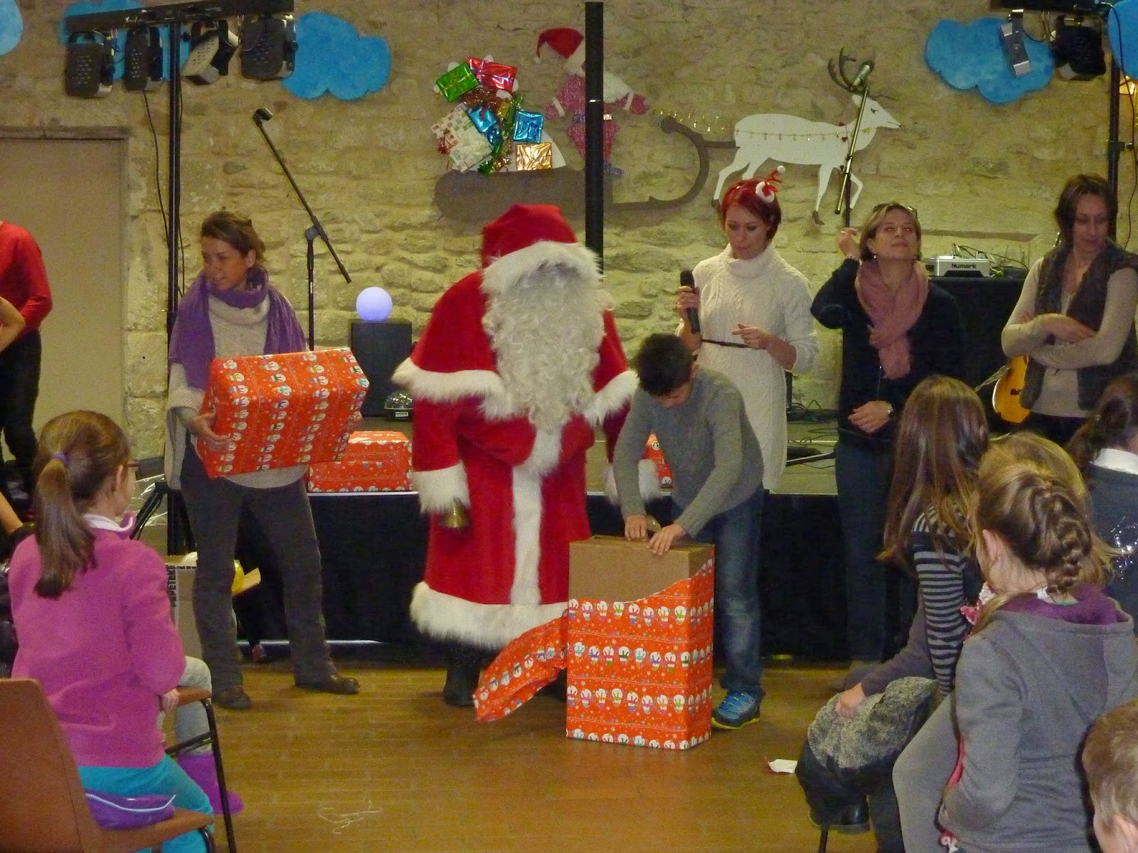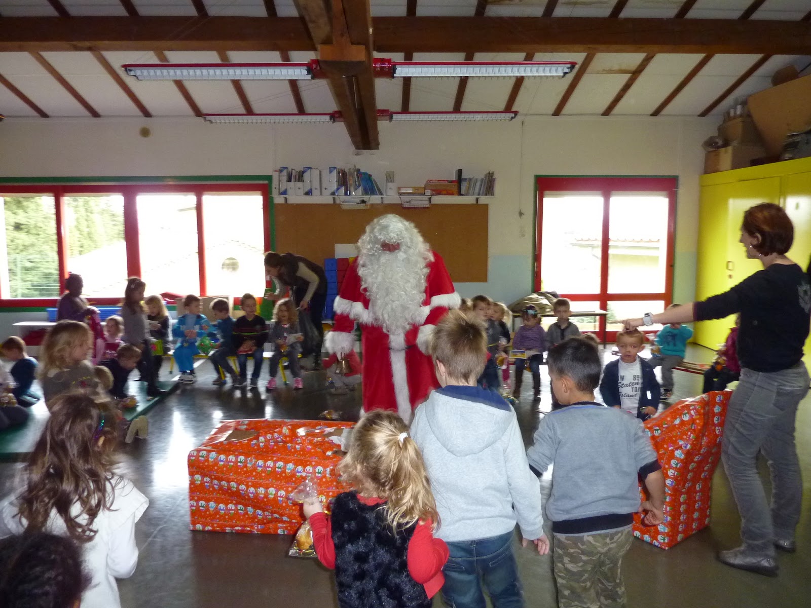 Après une demie heure de spectacle, nous avons entendu le Père Noël approcher avec sa clochette! Chaque enfant s’est vu remettre un cadeau individuel et un goûter offerts par l’Amicale et un cadeau commun par classe offert par la Mairie.